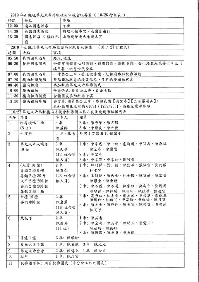 2019年山隴境華光大帝馬祖嶺南宗親會祝壽團行程表 1