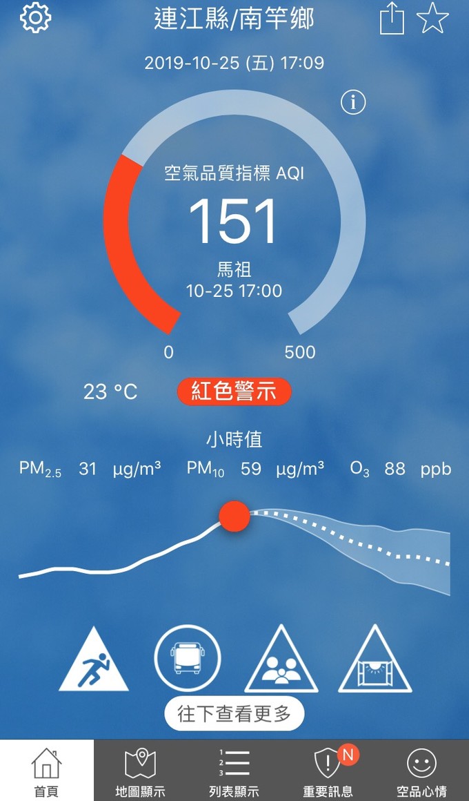 10/25空氣品質指標AQI 151 --閱讀人次 : 534 依據環保署今日(10月25日)下午17時空氣品質監測結果,馬祖地區受境外污染物影響,空氣品質指標AQI為151,對所有族群不健康,環境資源局提醒您