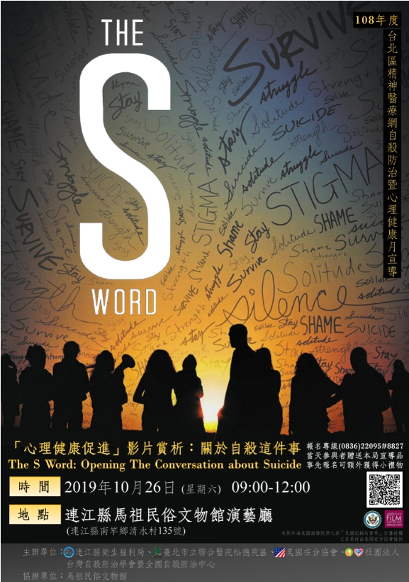 近年自殺相關事件頻傳,馬祖連江縣也不例外;為了達到更為完善並令民眾可以不再害怕且正視此事。本次連江縣衛生福利局心衛中心結合社會各類組織團體、村落、機關宣導「關於自殺這件事」,是一部紀錄片;由美國在台協會提供播出,希望藉由影片可以正確、正向的加強宣導,使民眾認知更為全面,以利預防相關憾事的發生。