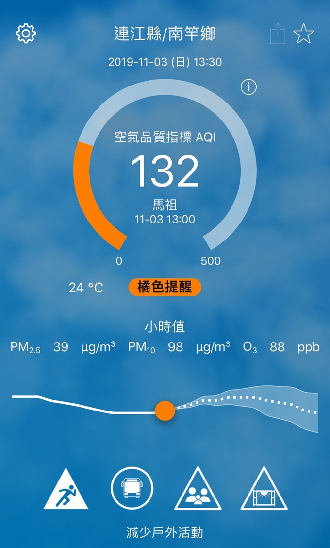 11/3空氣品質指標AQI 132 --閱讀人次 : 525 依據環保署今日(11月03日)下午13時空氣品質監測結果,馬祖地區受境外污染物影響,空氣品質指標AQI為132,對敏感族群不健康,環境資源局提醒您