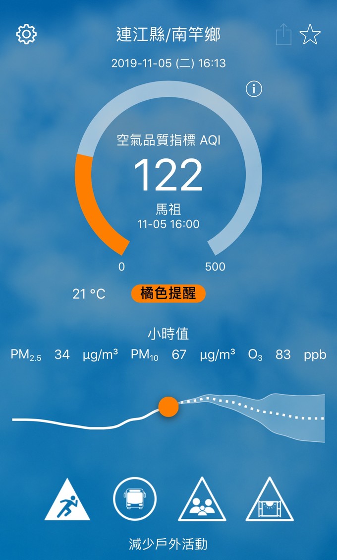 11/5空氣品質指標AQI 122 --閱讀人次 : 543 依據環保署今日(11月05日)下午16時空氣品質監測結果,馬祖地區受境外污染物影響,空氣品質指標AQI為122,對敏感族群不健康,環境資源局提醒您