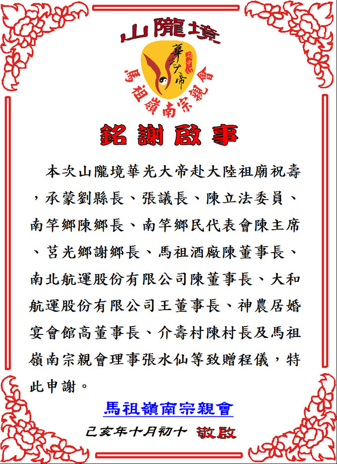 山隴境華光大帝祖廟參香祝壽銘謝啟事 --閱讀人次 : 1002