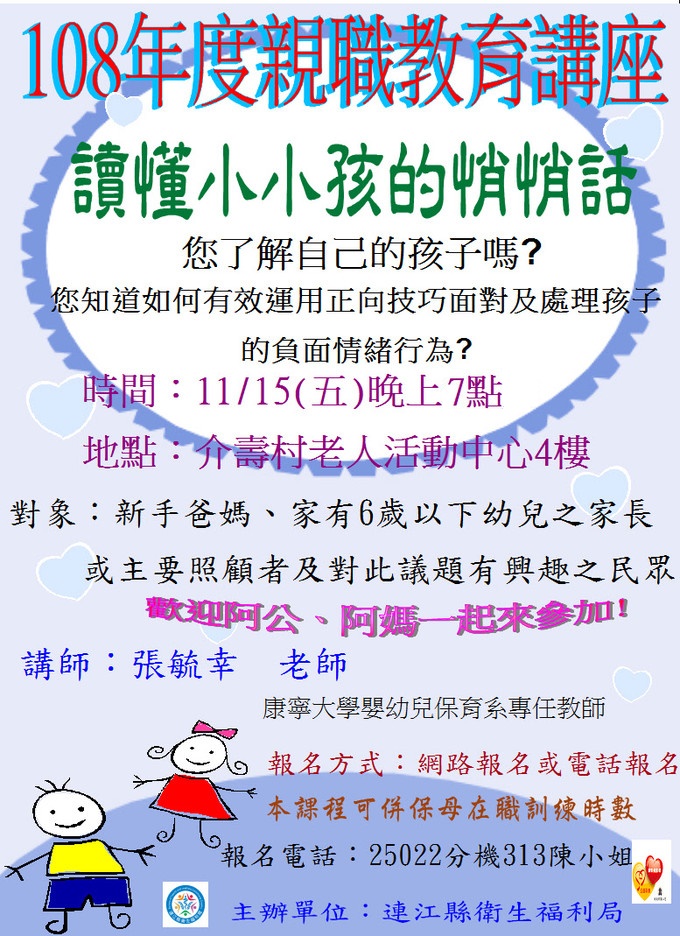 目的:推廣親職教育知識,強化照顧者的育兒條件與能力,提升家庭照顧功能。