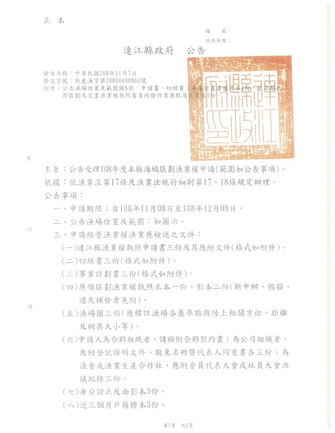 受理108年度連江縣海域區劃漁業權申請