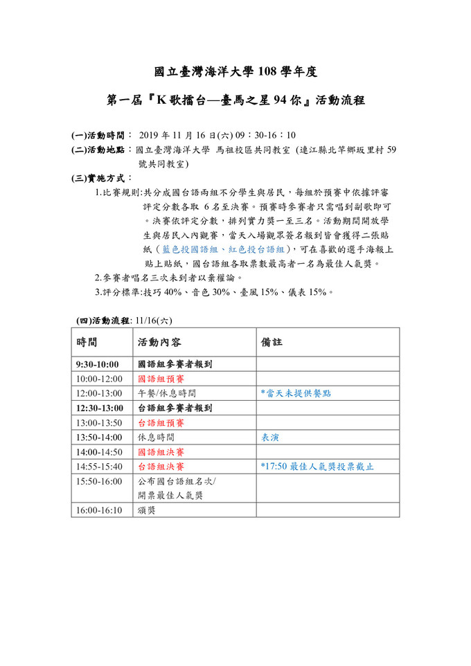 請各位參賽選手留意自己的上場順序及歌單有沒有誤,並注意當天活動流程
