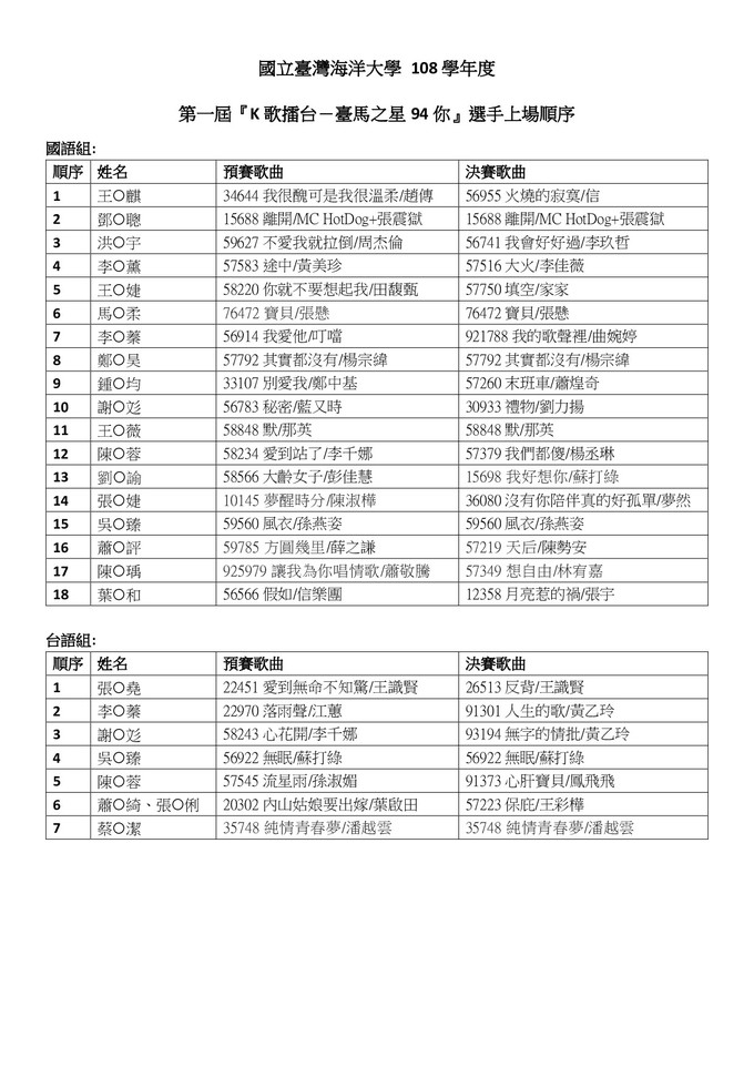 第一屆『K歌擂台—臺馬之星94你』上場名單順序出爐啦~