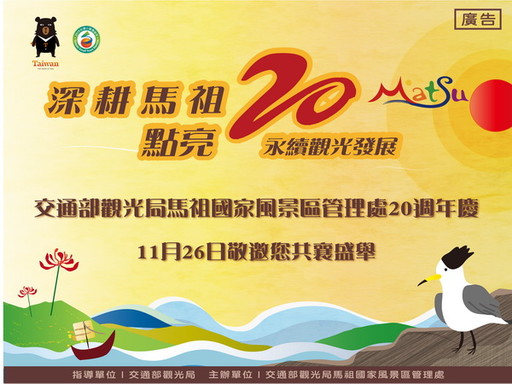 馬祖擁有特殊的戰地風貌與豐富的自然景觀,在歷經解除長達36年的戰地政務歲月後,於民國83年開放離島觀光,民國88年成為我國第6個國家級風景特定區,同年「交通部觀光局馬祖國家風景區管理處」成立迄今。走過風華歲月二十載,為慶祝馬祖開放觀光25週年及馬祖國家風景區管理處成立20週年,11月26日(星期二)上午8時將在南竿遊客中心,舉辦「深耕馬祖‧點亮20」處慶系列活動;當天並有日本山口縣美襧市「一般社團法人美禰市觀光協會」與「馬祖地質公園協會」締結簽約儀式,由日方代表致贈美襧市「市花」吉野櫻,藉此活動象徵兩地友誼締結,雙方在自然環境中相互交流學習,攜手為環境保護尋找合宜的方式並加以推廣運用,負起自然環境教育的責任,以期帶動觀光產業,並促進學術研究與交流。