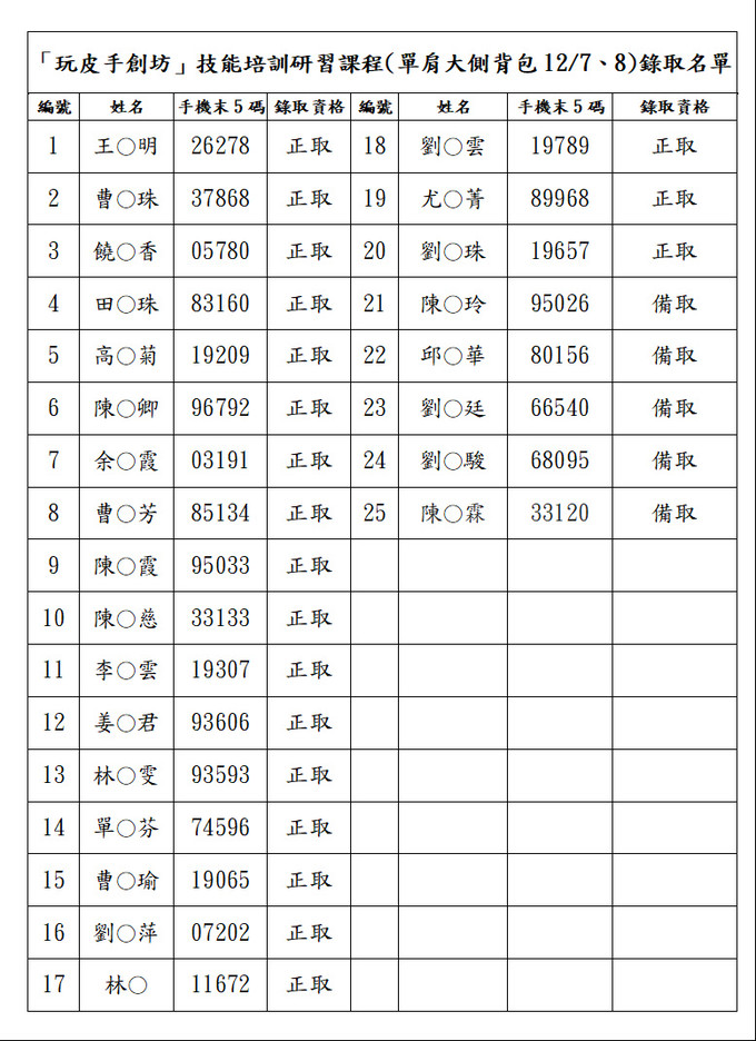 手工皮包技能培訓課程-錄取名單