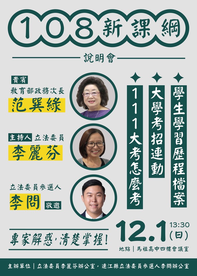 由 李麗芬 委員 與我一同邀請教育部范巽綠次長,與馬祖的學生家長們面對面交流,歡迎各位國中小與高中的家長同學們一同來參與。
