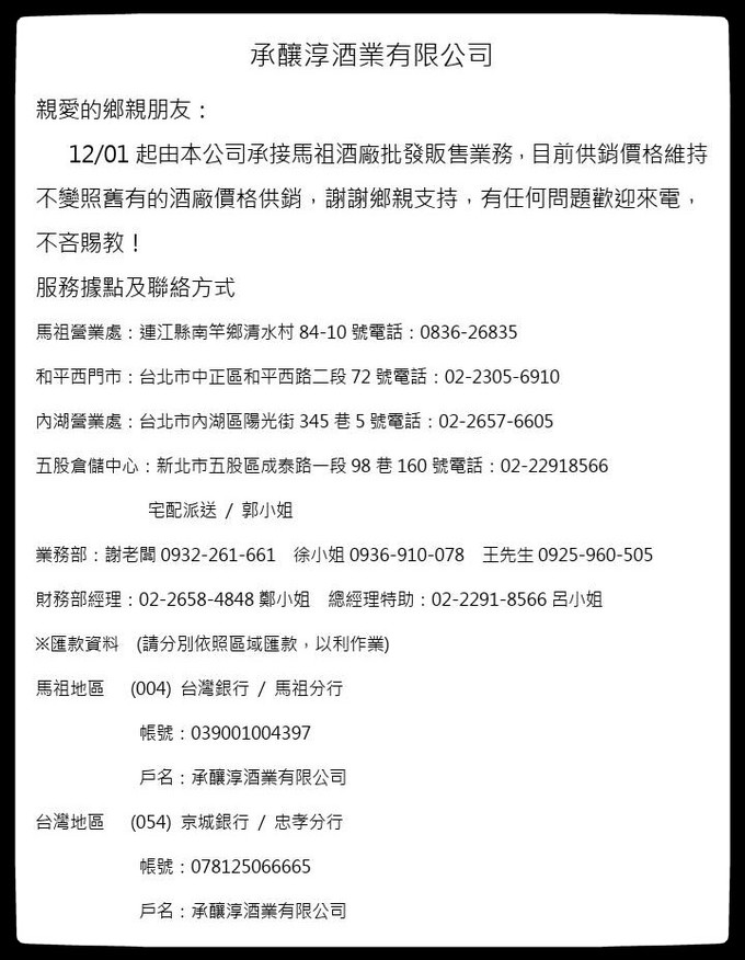 承釀淳酒廠總代理服務據點