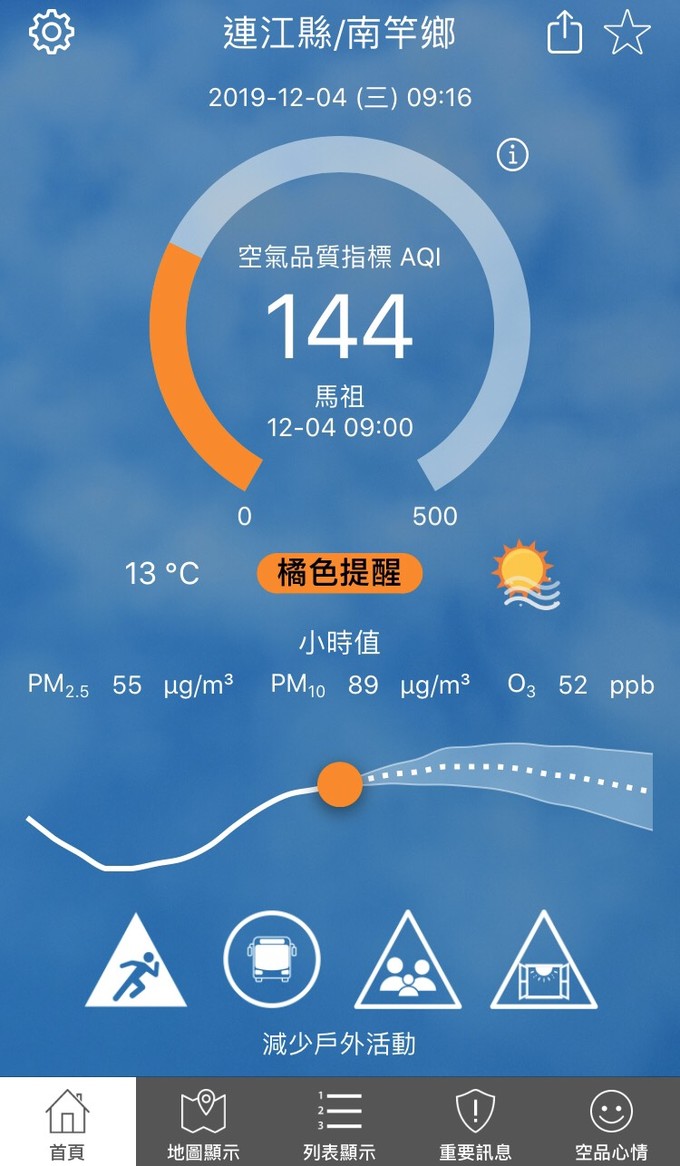 12/04空氣品質指標AQI 144 --閱讀人次 : 537 依據環保署今日(12月04日)上午09時空氣品質監測結果,馬祖地區受境外污染物影響,空氣品質指標AQI為144,對敏感族群不健康,環境資源局提醒您
