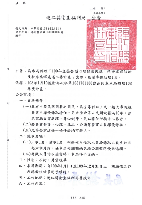 109年度整合型心理健康促進、精神疾病防治及特殊族群處遇工作計畫-約用人員1名。