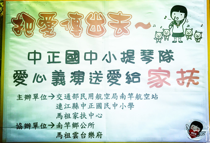 12/14,上午1000-1200於南竿機場,由中正國中小小提琴社在機場為您演奏動人的樂章,將所有義演所得捐給馬祖家扶,幫助地區有需要的孩童,特別感謝南竿航空站長期的支持,讓活動能夠順利舉辦延續下去。