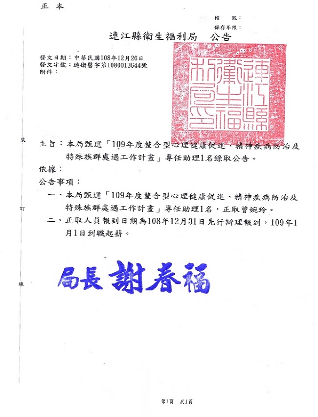109年連江縣衛生福利局整合型心理健康工作計畫徵選錄取公告