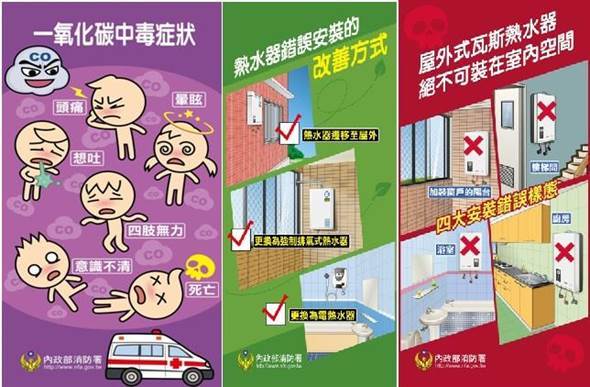 二.萬一受限於環境等因素,只能在屋內安裝熱水器時,應選用強制排氣 型或電熱型熱水器並加裝一氧化碳偵測器,同時保持通風。