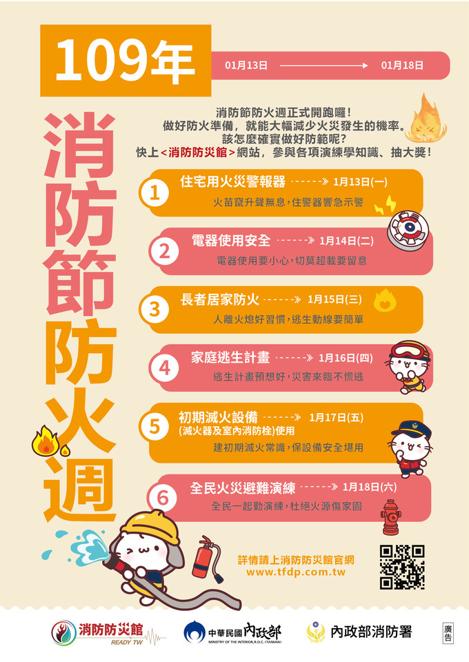 為配合消防節防火週活動,向民眾推廣正確防火知識與火災緊急應變能力,提升民眾防火意識,做好隨時防火準備,以降低人命財產損失,邀請大家於1/13-1/18至內政部消防署「消防防災館網https://www.tfdp.com.tw」有規劃全民火災避難演練及居家防火網頁遊戲,活動內容有獎徵答體驗活動,請大家踴躍參加。
