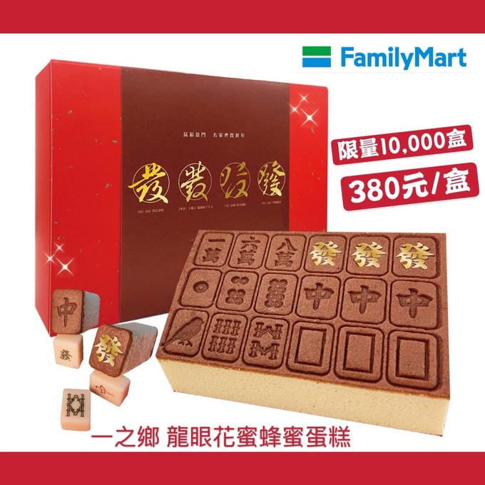招牌蜂蜜蛋糕,烙印上象徵財富、好運、福氣集一身的麻將圖案,再加上師博手工佐上【發發發】的金粉,呈現閃亮亮的貴氣,顆顆都充滿師傅的手工心意,在新的一年祝福親朋好友好禮連連!