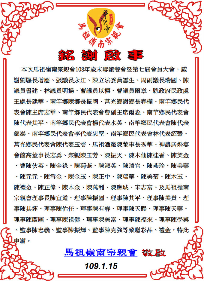 馬祖嶺南宗親會 感謝各界