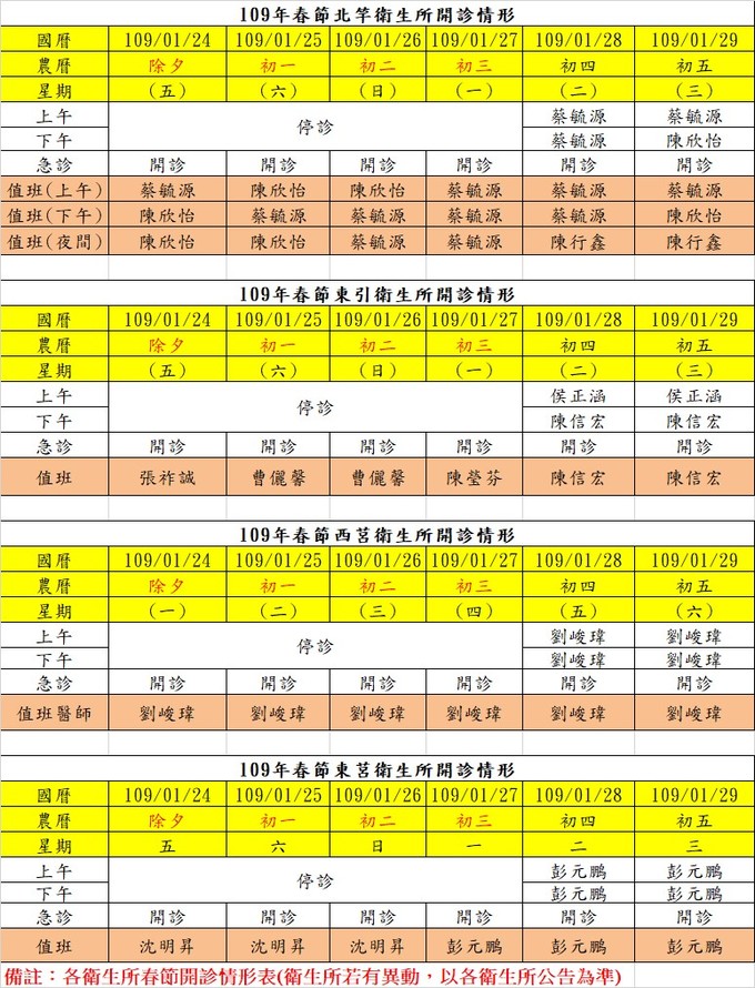 109年各衛生所春節開診情形表