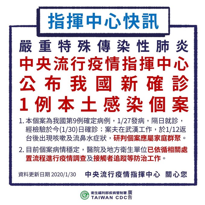 中央流行疫情指揮中心 公布我國新增確診1例本土嚴重特殊傳染性肺炎個案,1月27日發病,28日就診,經檢驗於今(30)日確診;案夫在武漢工作,於1月12日返台後出現咳嗽及流鼻水症狀,研判個案應屬家庭群聚,目前個案病情穩定,醫院及地方衛生單位已依循相關處置流程進行疫情調查及接觸者追蹤等防治工作。