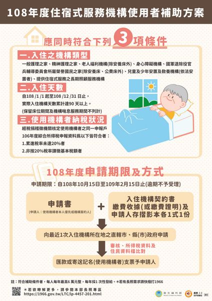 住宿式服務機構使用者補助、長照扣除額 --閱讀人次 : 723 有關住宿式服務機構使用者補助方案