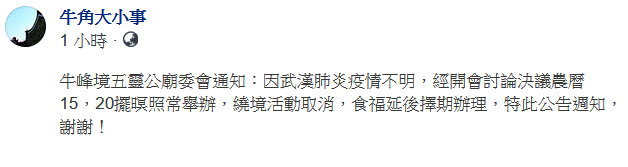 牛峰境五靈公廟委會公告:食福延期舉行