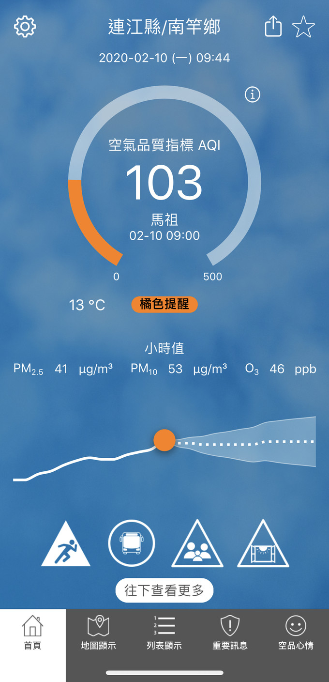 02/10空氣品質指標AQI 103 --閱讀人次 : 545 依據環保署今日(02月10日)上午09時空氣品質監測結果,馬祖地區受境外污染物影響,空氣品質指標AQI為103,對敏感族群不健康,環境資源局提醒您