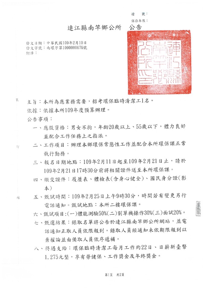 南竿鄉公所招考環保臨時清潔工一名