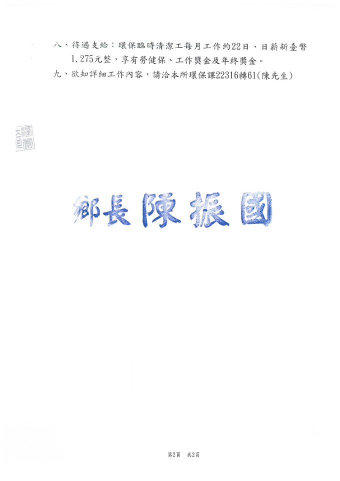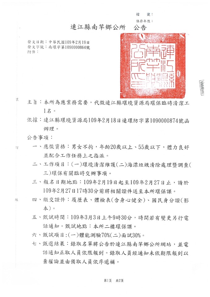 南竿鄉公所代徵環保臨時清潔工一名