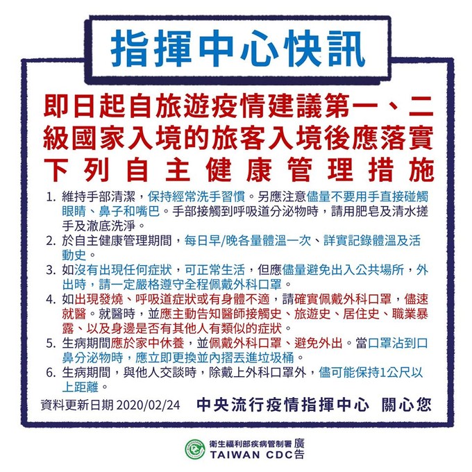 一、二級國家入境須自主健康管理14天