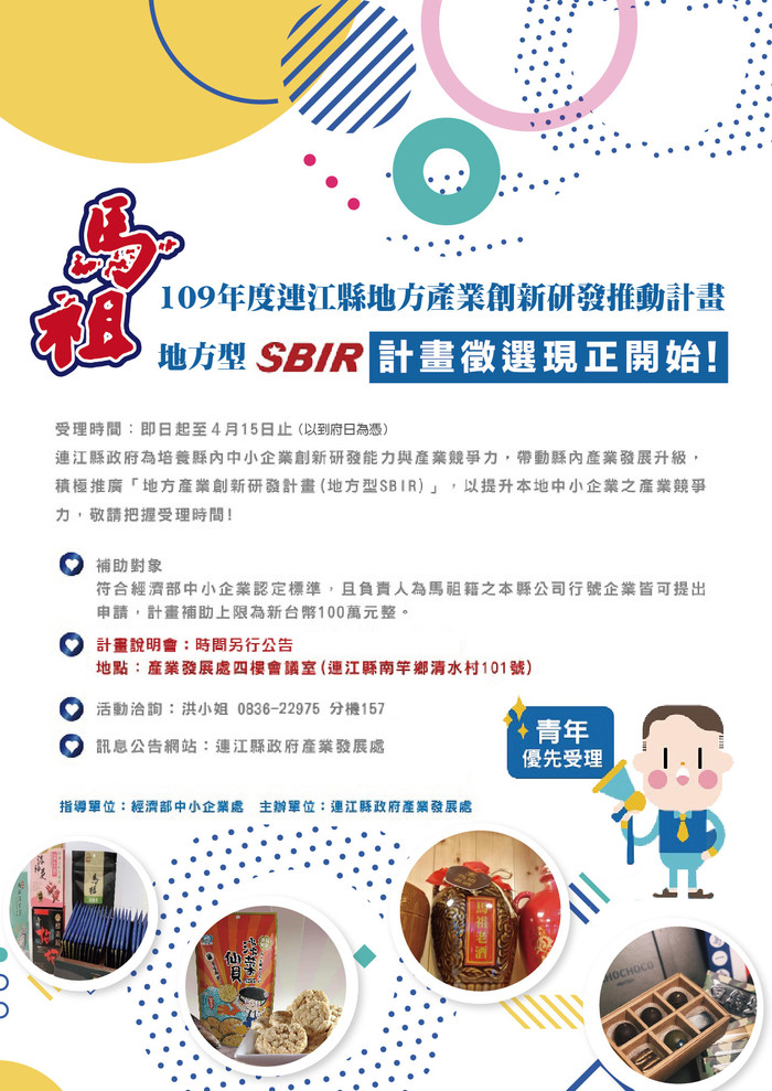 109年連江縣地方型SBIR申請書範本、撰寫說明附件表單歡迎下載利用,第一階段收件時間至109年4月15日(以到府日為憑)。 若無法下載請洽本府產業發展處洪小姐索取,電話:0836-22975#157。