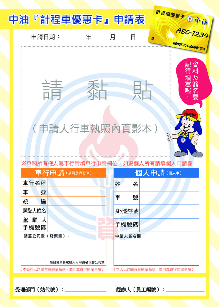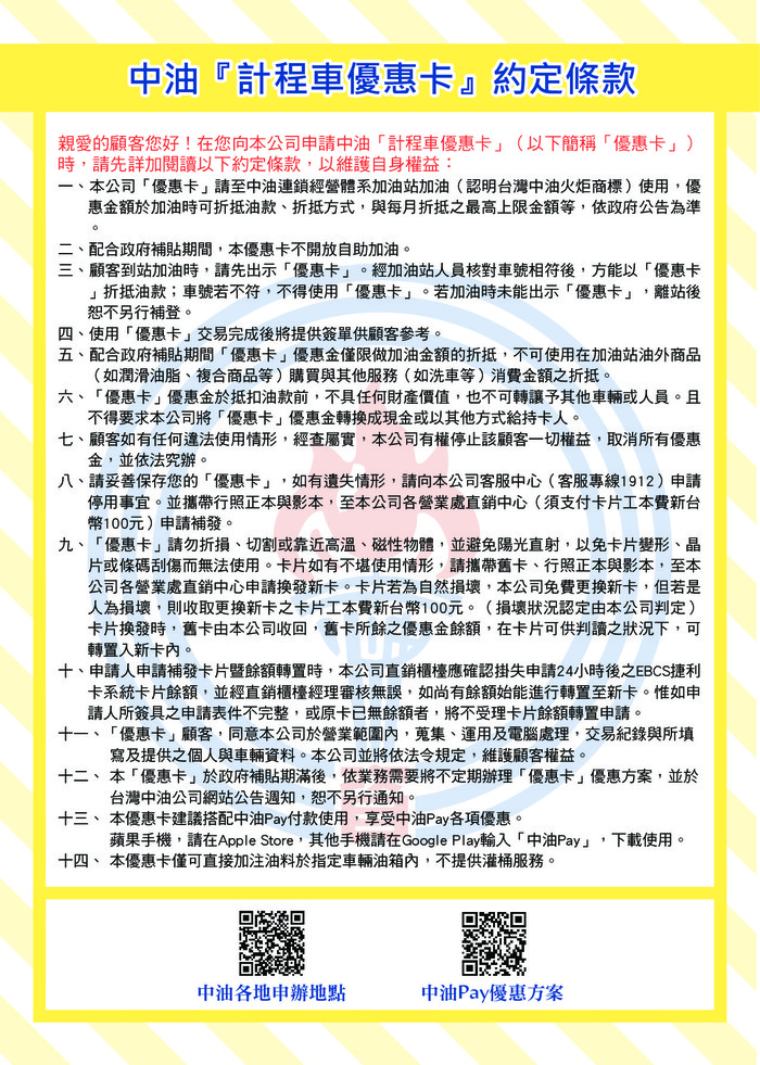 為配合交通部計程車加油補貼政策,本公司代台灣中油股份有限公司辦理馬祖地區計程車優惠卡申請作業,請符合資格之計程車駕駛或車行於3月20日前備妥行車執照及內頁影本至本公司福澳加油站辦理,以便製作卡片
