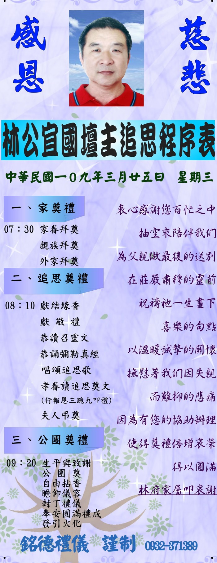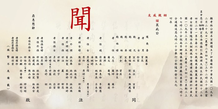 顯考林公諱名宜國壇主了却塵緣,敬邀諸親友前往參加公祭。