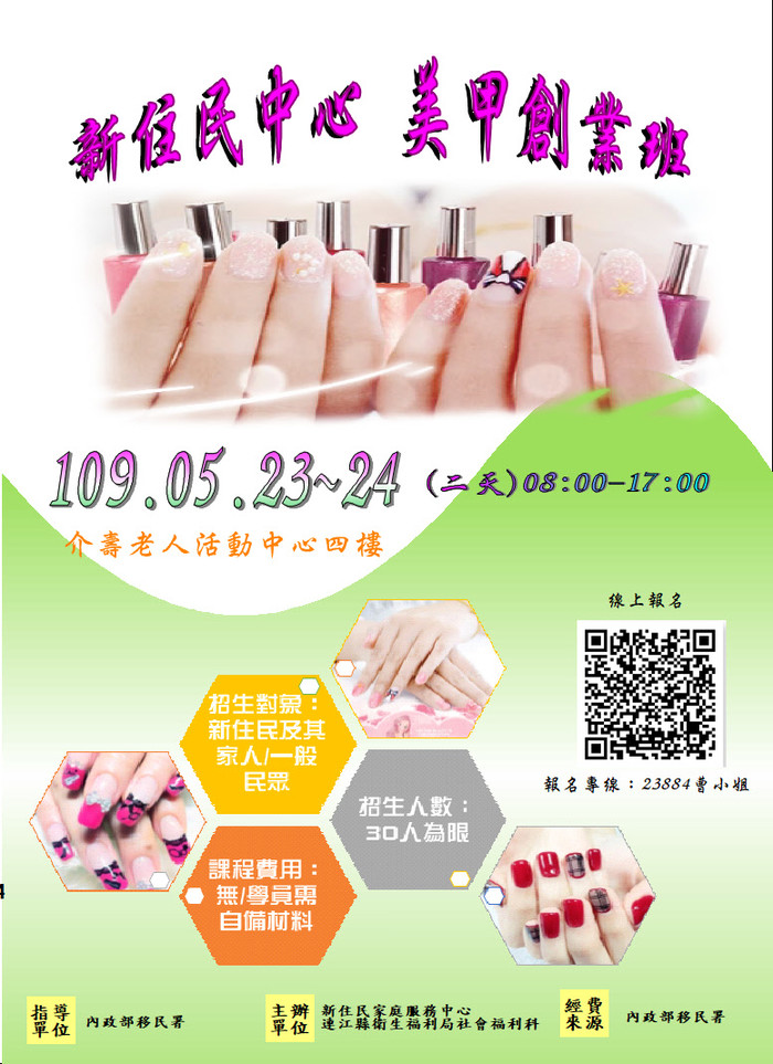 招生對象:新住民及其家人優先/尚有名額開放一般民眾參加 (以報名先後順序為主,錄取者3月31日統一由承辦人邀請加入美甲創業班LINE群組,其餘未錄取人員,不另行通知)