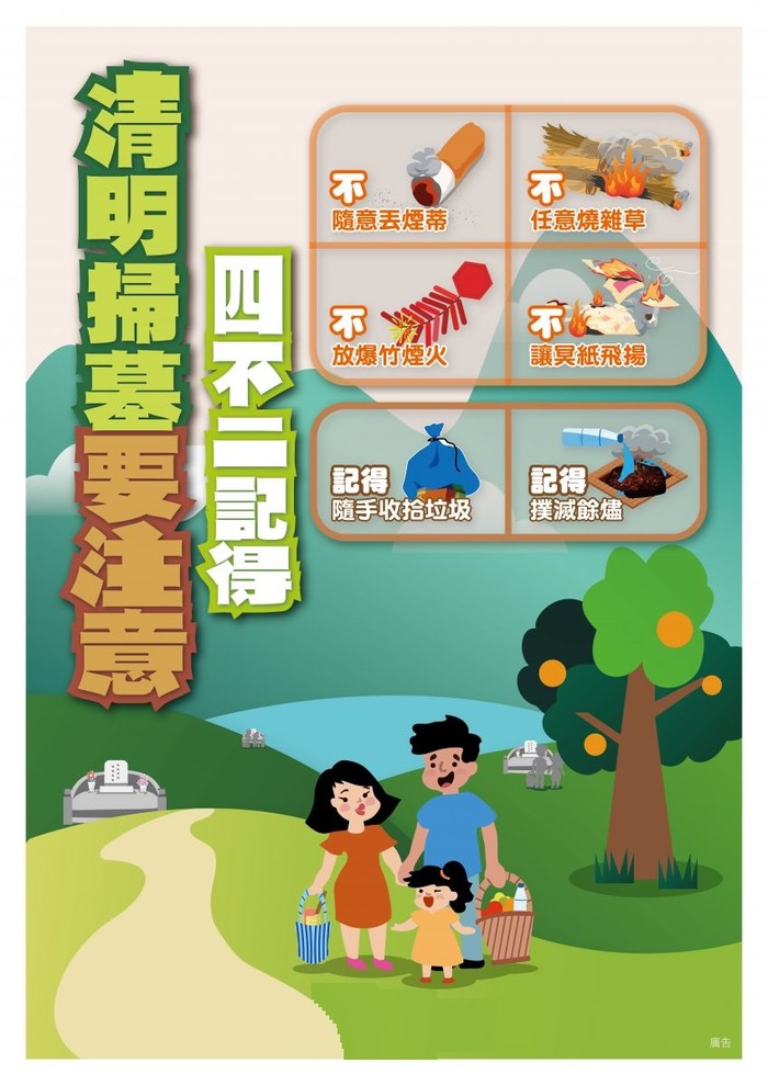 清明節即將到來,消防局莒光分隊提醒您,在緬懷先人之際,也要隨手做好山林維護。掃墓祭祖的過程中,需留意自身安全及水份補充,為了避免林野墓地火災的發生,請您務必遵行