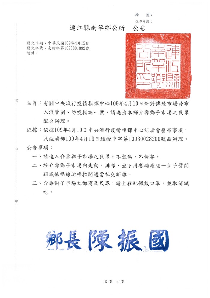 南竿鄉公所公告:獅子市場實施人流管制、全程配戴口罩