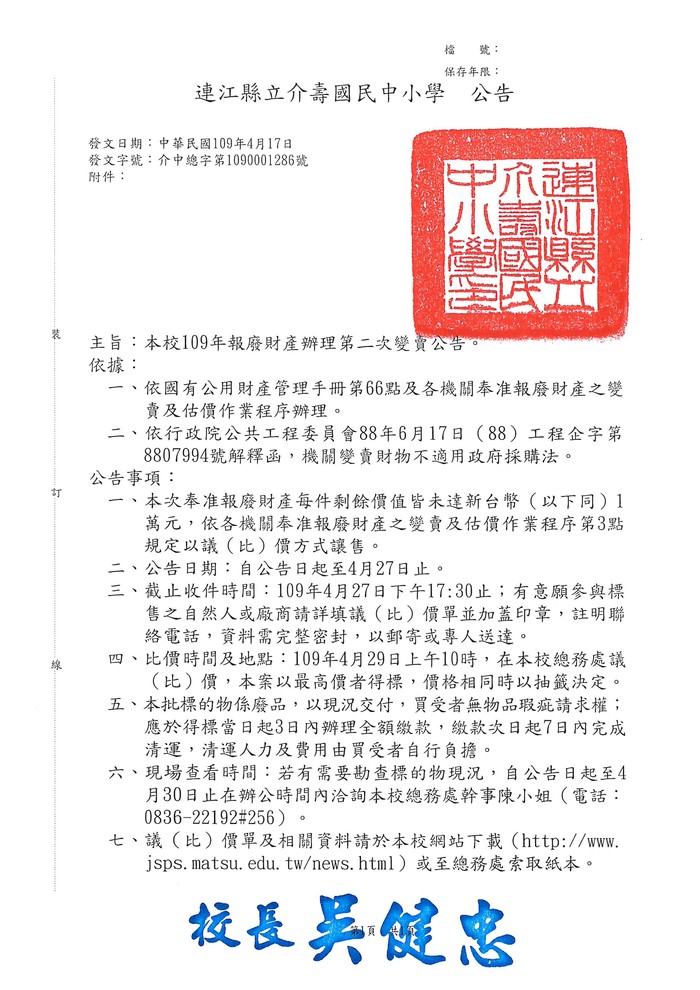 介壽國中小報廢財產第二次變賣公告