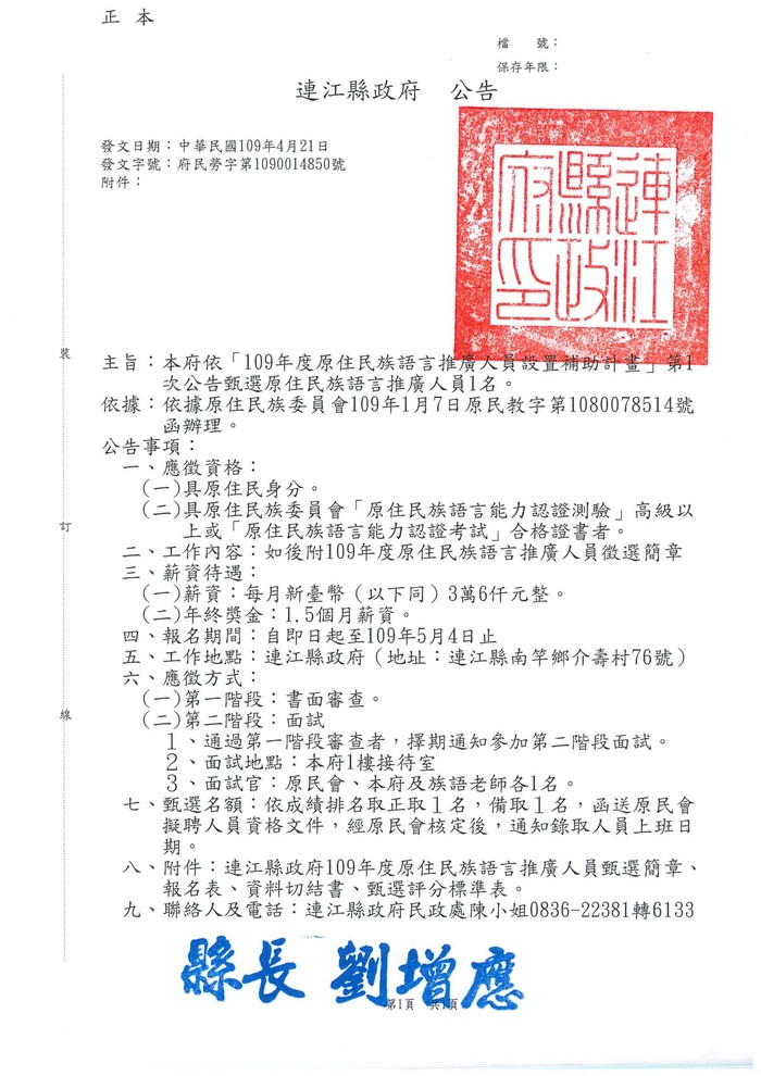 公告甄選原住民族語言推廣人員1名