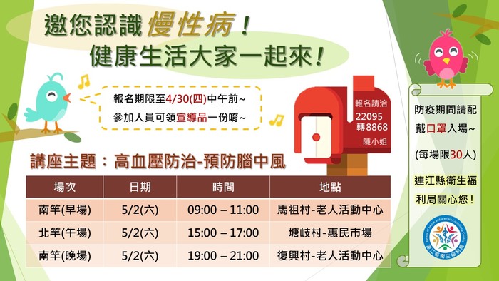 二、本活動採報名制,每場限30人(額滿為止)。報名請洽22095分機8868 衛生福利局 保健科 陳小姐