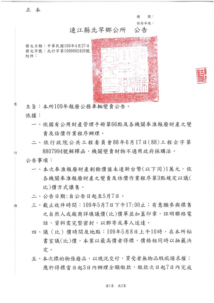 109年度北竿鄉公所報廢公務車輛議(比)價單.doc