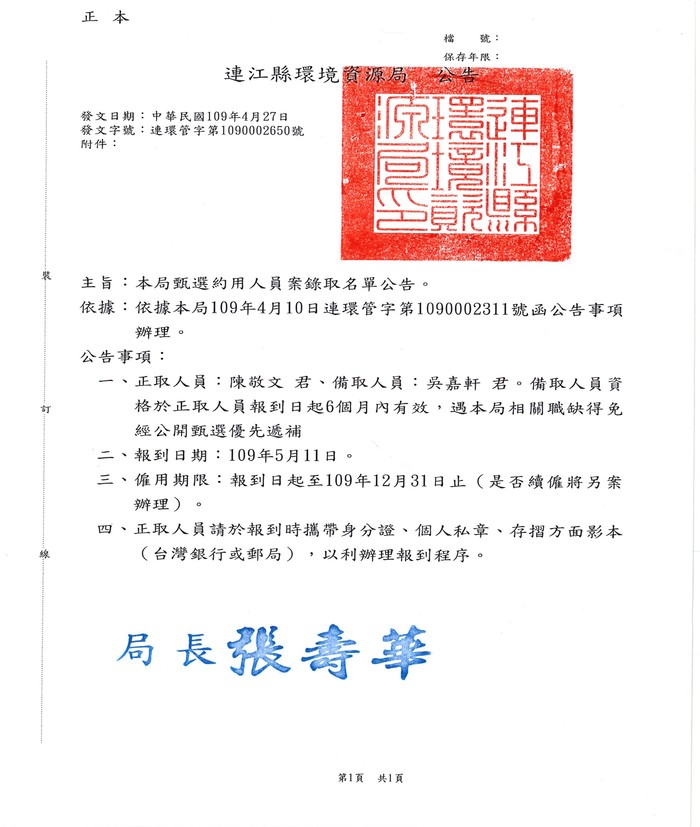 一、正取人員:陳敬文 君、備取人員:吳嘉軒君。備取人員資格於正取人員報到日起6個月內有效,遇本局相關職缺得免經公開甄選優先遞補。