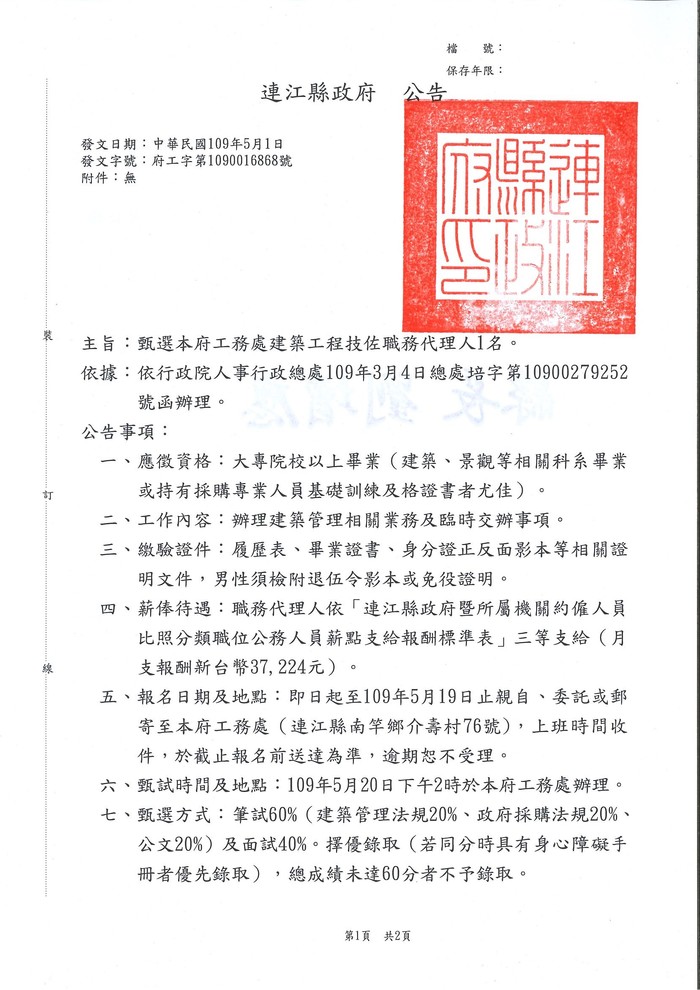 縣府工務處甄選技佐職代1名