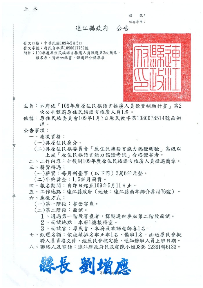 109年度原住民族語言推廣人員第2次徵選簡章附件