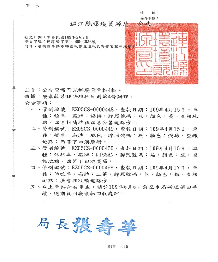公告查報莒光鄉廢棄車輛4輛