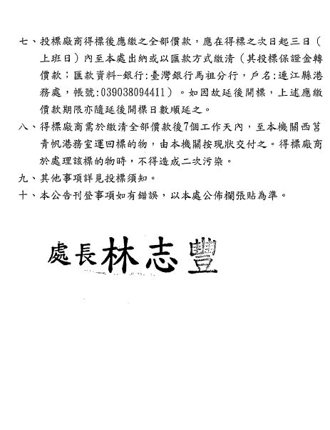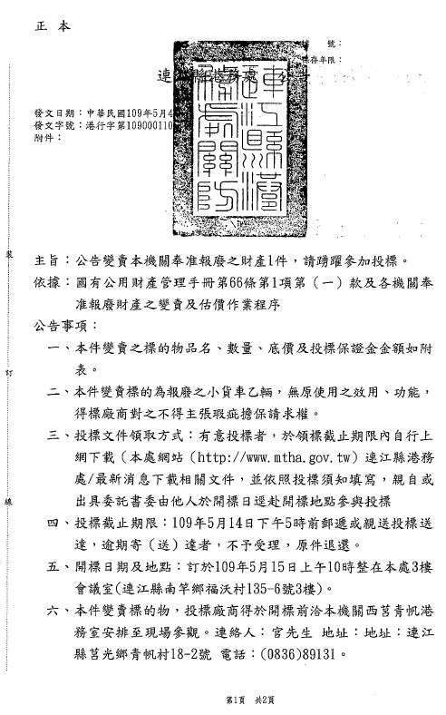 連江縣港務處報廢財產變賣公告