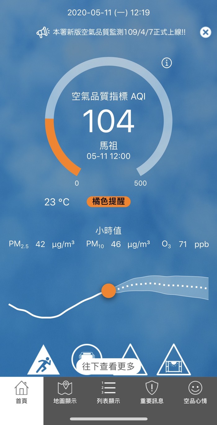 05/11空氣品質指標AQI 104 --閱讀人次 : 521 依據環保署今日(05月11日)下午12時空氣品質監測結果,馬祖地區受境外污染物影響,空氣品質指標AQI為104,對敏感族群不健康,環境資源局提醒您