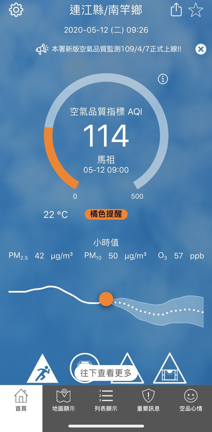 05/12品質指標AQI 114 --閱讀人次 : 515 依據環保署今日(05月12日)上午09時空氣品質監測結果,馬祖地區受境外污染物影響,空氣品質指標AQI為114,對敏感族群不健康,環境資源局提醒您
