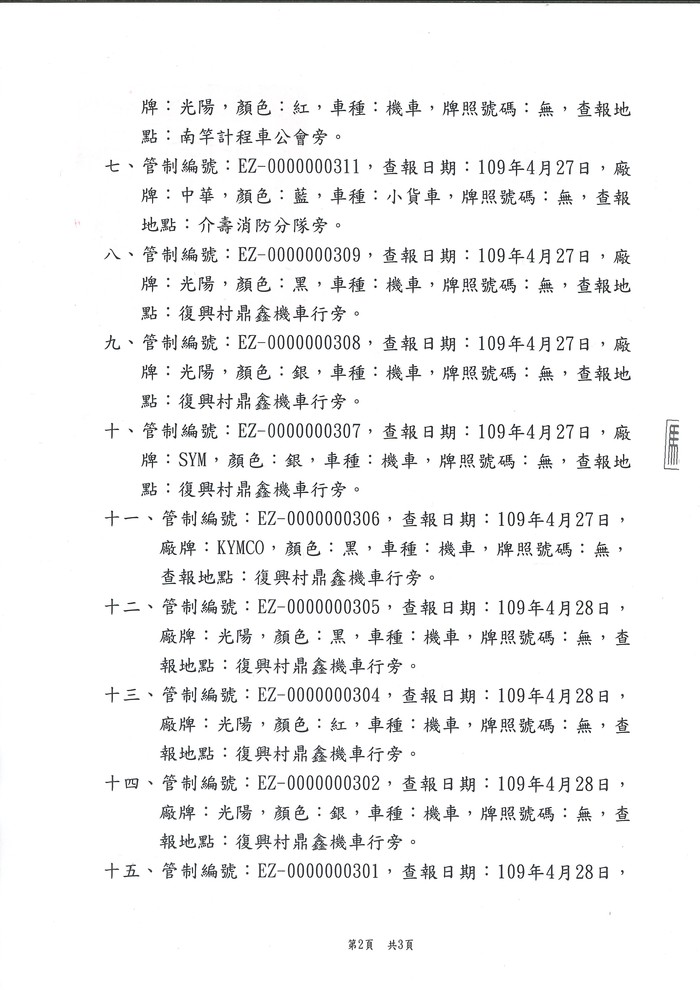 十五、管制編號:EZ-0000000301,查報日期:109年4月28日,廠牌:三陽,顏色:白,車種:機車,牌照號碼:無,查報地點:復興村鼎鑫機車行旁。
