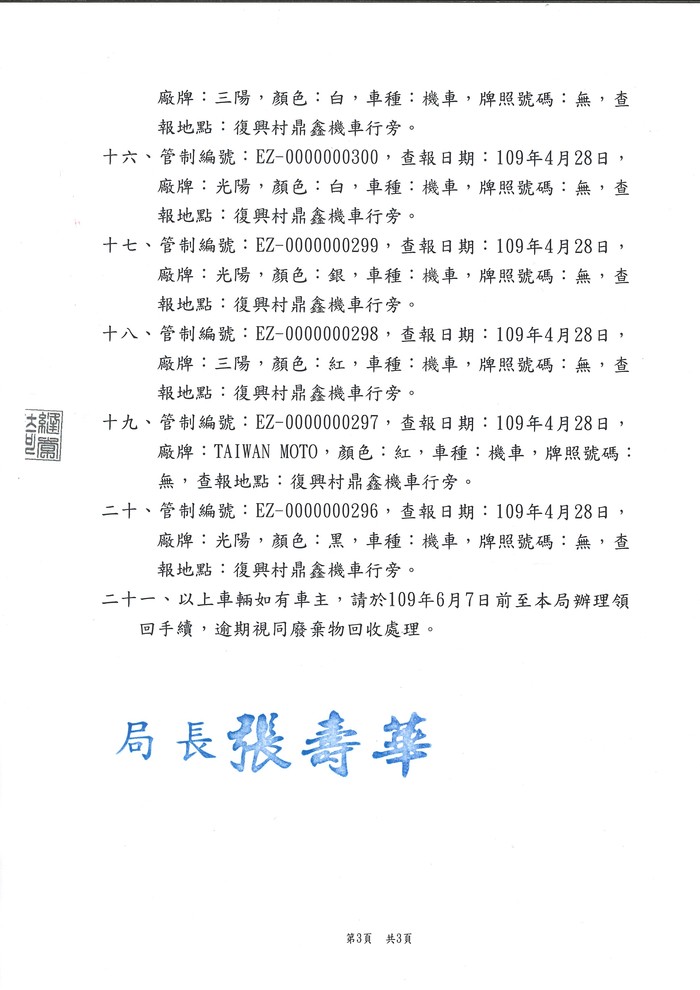 二十一、 以上車輛如有車主,請於109年6月7日前至本局辦理領回手續,逾期視同廢棄物回收處理。