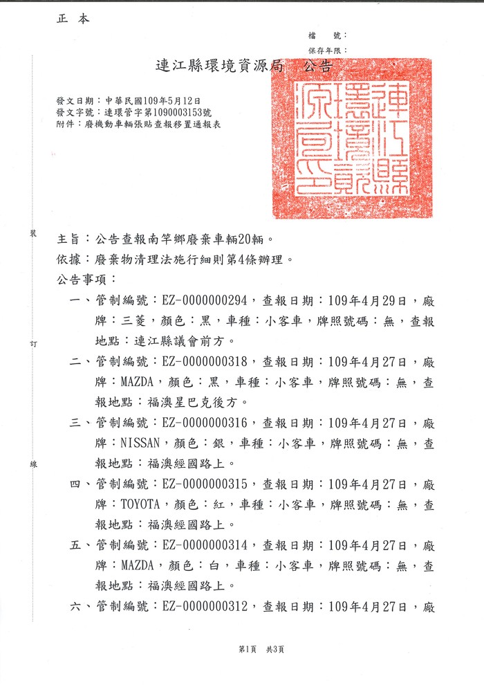 公告查報南竿鄉廢棄車輛20輛 --閱讀人次 : 1298 主旨:公告查報南竿鄉廢棄車輛20輛。